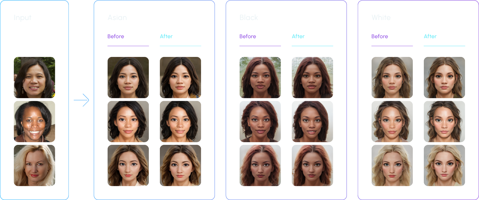 Background: Bias in generative image models Training generative visual models on biased data or datasets lacking diversity can make the models struggle to accurately represent the full spectrum of human diversity, particularly race and gender. The imbalance in training data is a well-known issue from prior research (Reference : Maluleke, Vongani H., et al. “Studying Bias in GANs through the Lens of Race.” European Conference on Computer Vision (2022)) that often leads to models disproportionately generating outputs that reflect the majority group while omitting or inadequately representing minority groups. Most facial generation models rely on the commonly used training dataset FFHQ, which exhibits extreme bias: 69.2% of the dataset comprises Caucasian individuals, while only 4.2% represents Black individuals. This bias is further exacerbated during inference when techniques to enhance image quality, such as truncation, are applied.